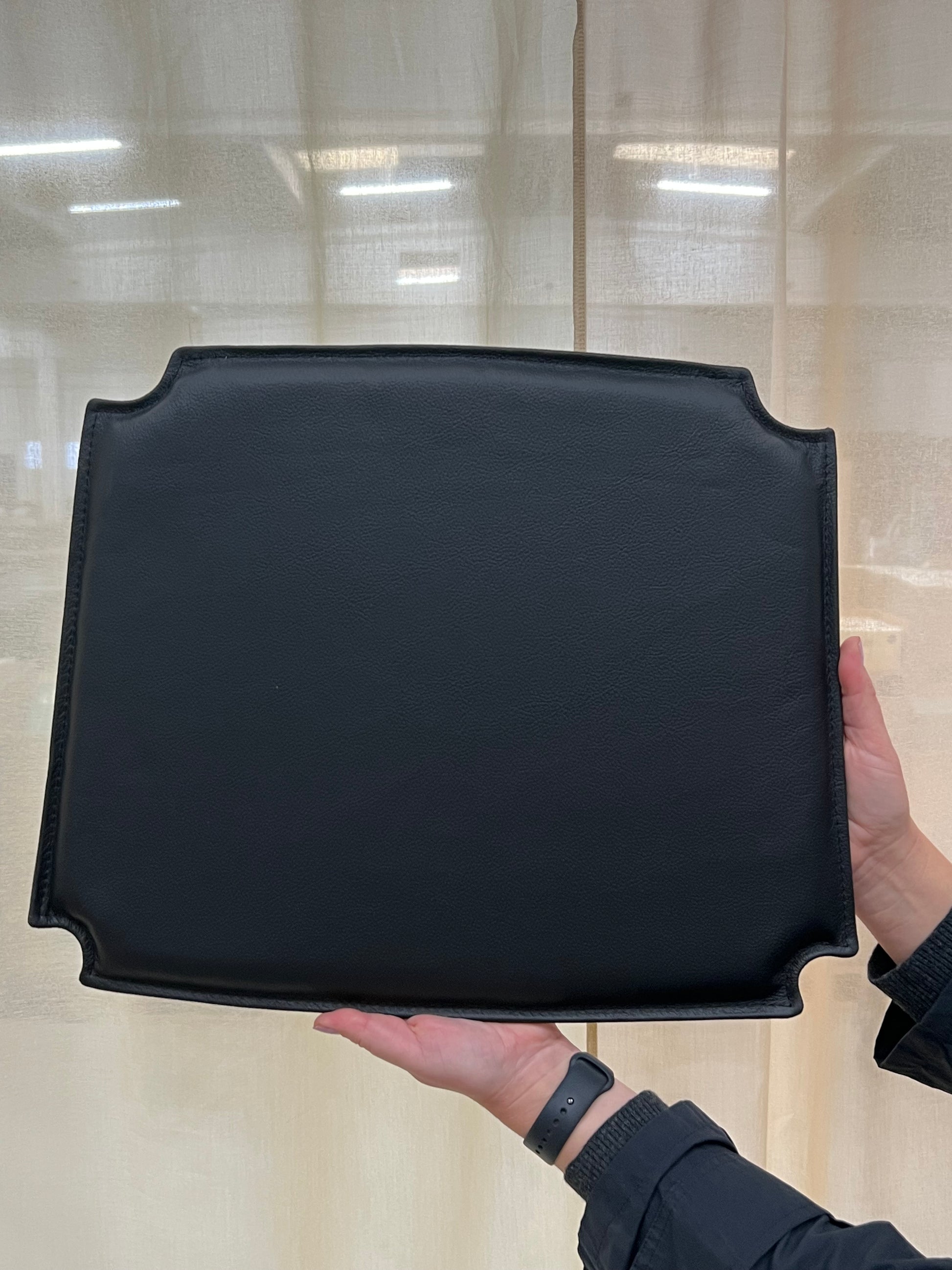 Werten Sie Ihren CH24 Y-Sessel mit diesem schönen, einzigartigen Kissen auf, das passgenau zugeschnitten und mit schwarzem Leder bezogen ist.