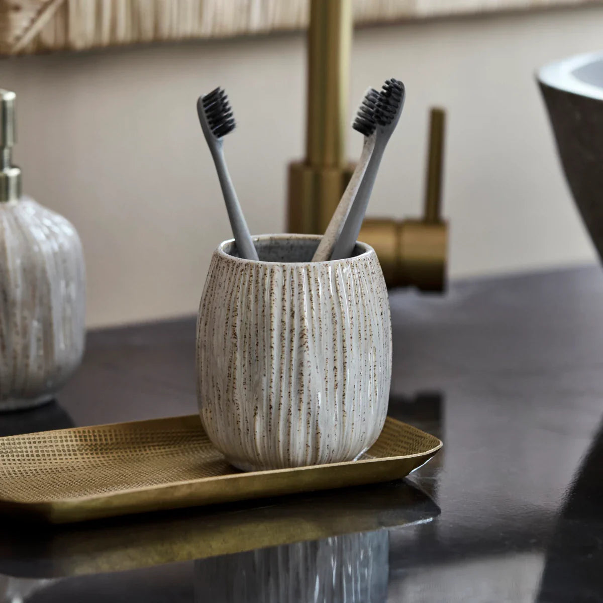 Tilføj et strejf af elegance til dit badeværelse med denne keramiske tandbørsteholder i en smuk off-white finish.