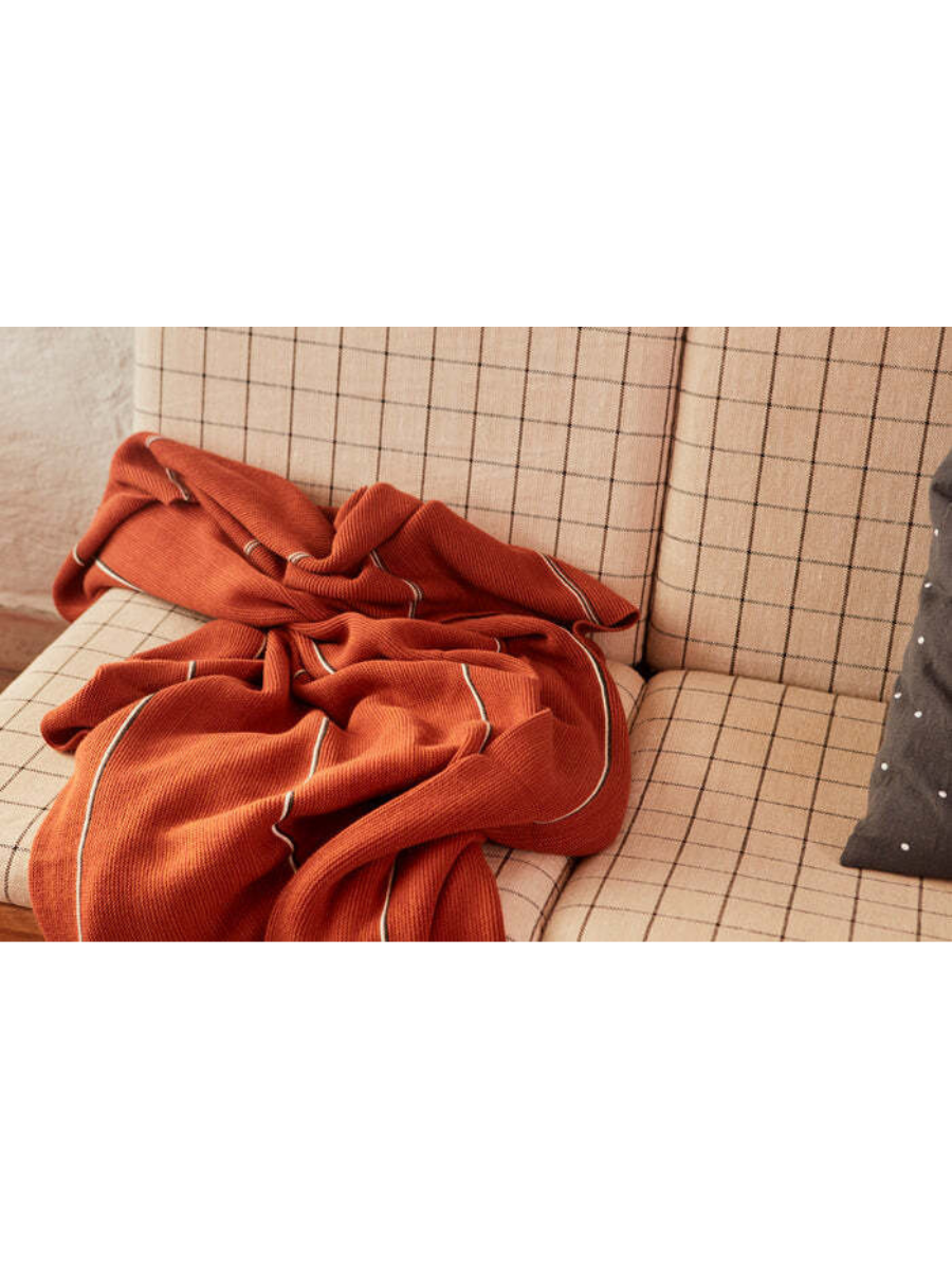 OYOY's Rivi Living Plaid i varm nutmeg er et elegant og blødt tæppe på 134x184 cm, lavet af 100% økologisk bomuld. Det tidløse stribedesign tilføjer et moderne touch til dit hjem, mens den økologiske kvalitet sikrer både komfort og bæredygtighed. Perfekt til hyggelige aftener og som dekorativt element i din indretning.